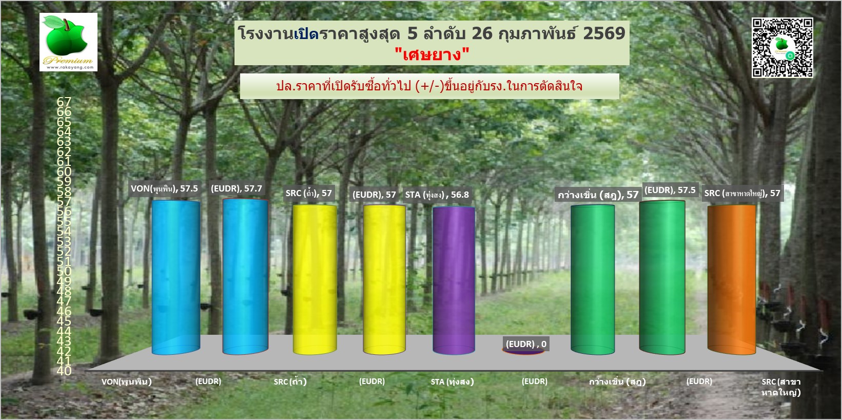 สรุปราคายางแผ่นรม/ดิบ เศษยาง เครฟ โรงงานทั่วไปประจำวัน พฤหัสฯ ที่ 26 กุมภาพันธ์ 2569