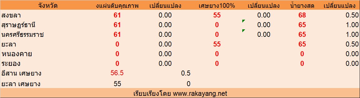 จังหวัด สงขลา ยางแผ่นดิบคุณภาพ 3 = 61บาท/กก. ราคาไม่เปลี่ยนแปลง เศษยาง 55บาท/กก. ราคาไม่เปลี่ยนแปลง บาท/กก. น้ำยางสด ราคา ณ โรงงาน 68บาท/กก. ราคาเพิ่มขึ้น 0.50บาท