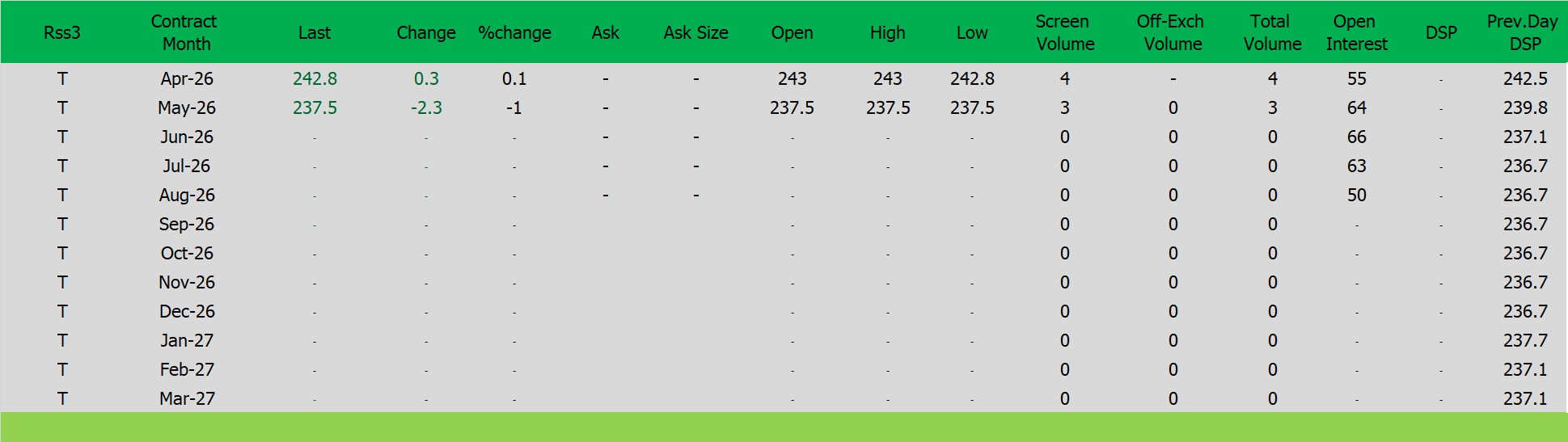 ราคายางRSS3 ตลาดยางSICOM ราคาส่งมอบเดือน มี.ค.ปิดที่242.8 เซนต์สหรัฐ ราคาเพิ่มขึ้น 0.3 เซนต์สหรัฐหรือ คิดเป็นเปอร์เซนต์ +0.12% %