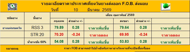รายละเอียดราคาประกาศเที่ยงวันยางส่งออก F.O.B. ส่งมอบ ประจำวัน อังคาร ที่ 10 มีนาคม 2569